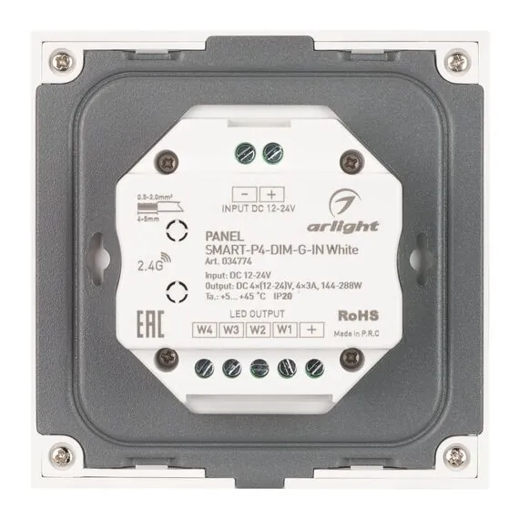 Arlight 034774 Панель SMART-P4-DIM-G-IN White (12-24V, 4x3A, Sens, 2.4G) (Arlight, IP20 Пластик, 5 лет) - ! УПАКОВКА СОСТОИТ ИЗ - 1 шт