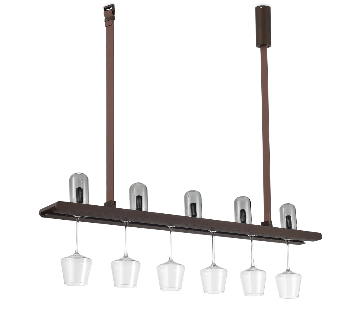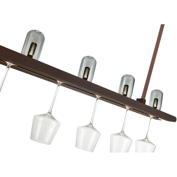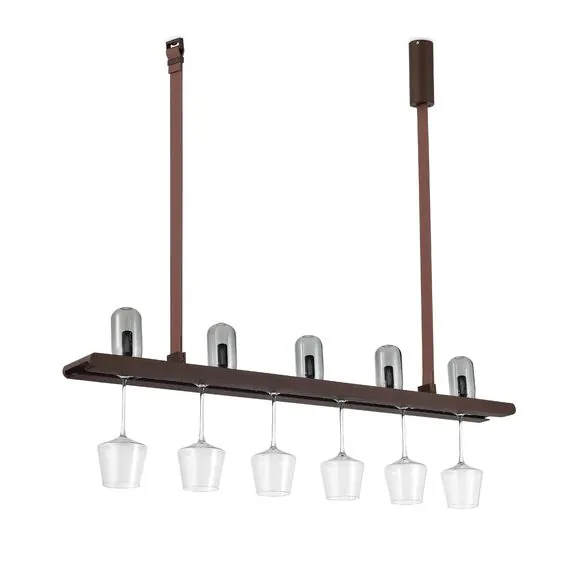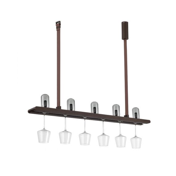Светильник имеет тип свечения Up&Down: В верхней части расположены 5 светодиодов мощностью 0,5Вт для мягкого фонового освещения, вниз же направлена яркая светодиодная линейная подсветка мощностью 17,5Вт. Направляющая в нижней части светильника позволяет подвешивать различные типы бокалов и фужеров, красота которых будет выгодно подчеркнута мягкой теплой подсветкой.