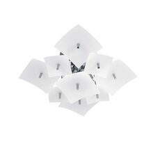 Каркас светильника изготовлен из хромированного метала, декорирован белыми матовыми стеклами. Светильник потолочно-настенного монтажа, но при помощи комплекта креплений становится подвесным. Три размера, дополнены бра. Тип крепления – планка.