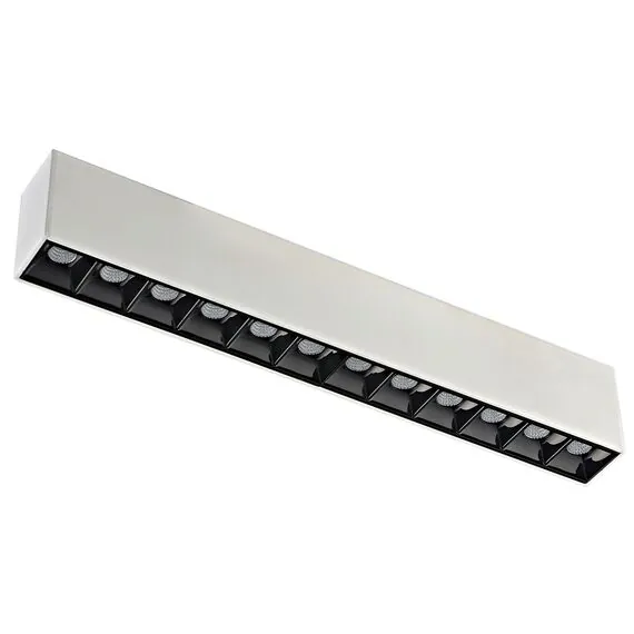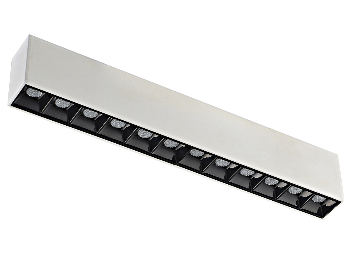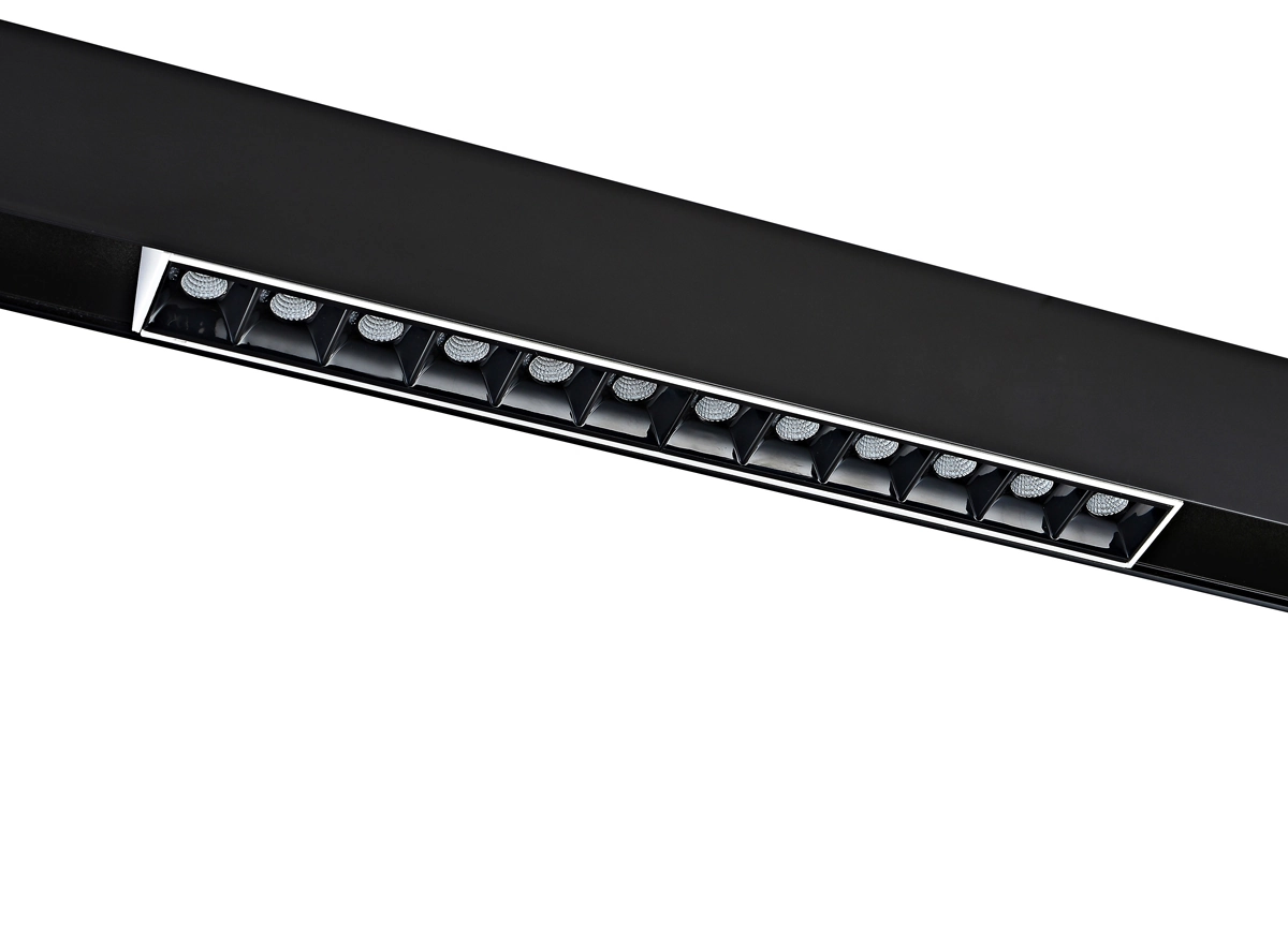 Источник света в виде рефлектора изготовлен из черного глянцевого пластика. Конструкция рефлектора подавляет блики, а зеркальная поверхность отражателя многократно увеличивает светоотдачу. Светильник целиком утапливается в корпус магнитной шины. Дает направленный теплый свет. Корпус изготовлен из алюминия. Опционально: управление по протоколу DALI.