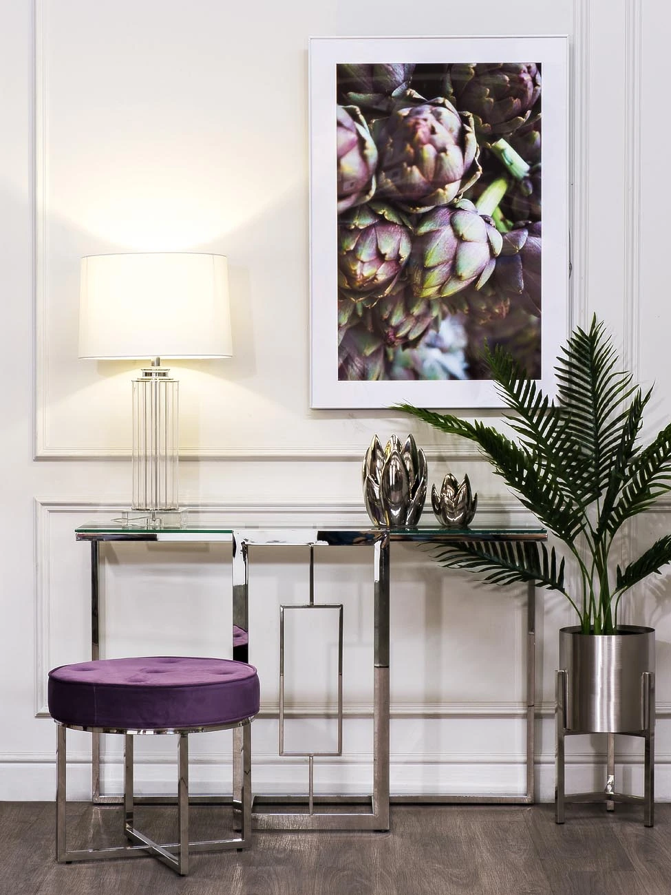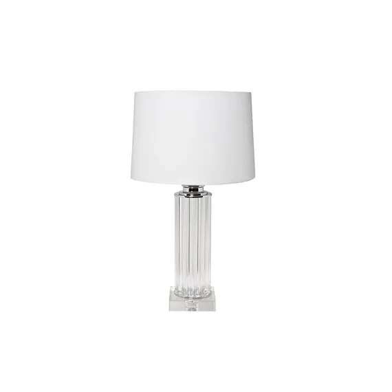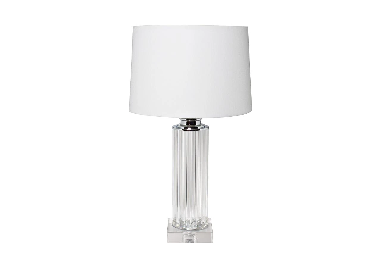 Основание - металл никелированный цвет хром, ножка стеклянная; плафон - ткань светло-серого цвета