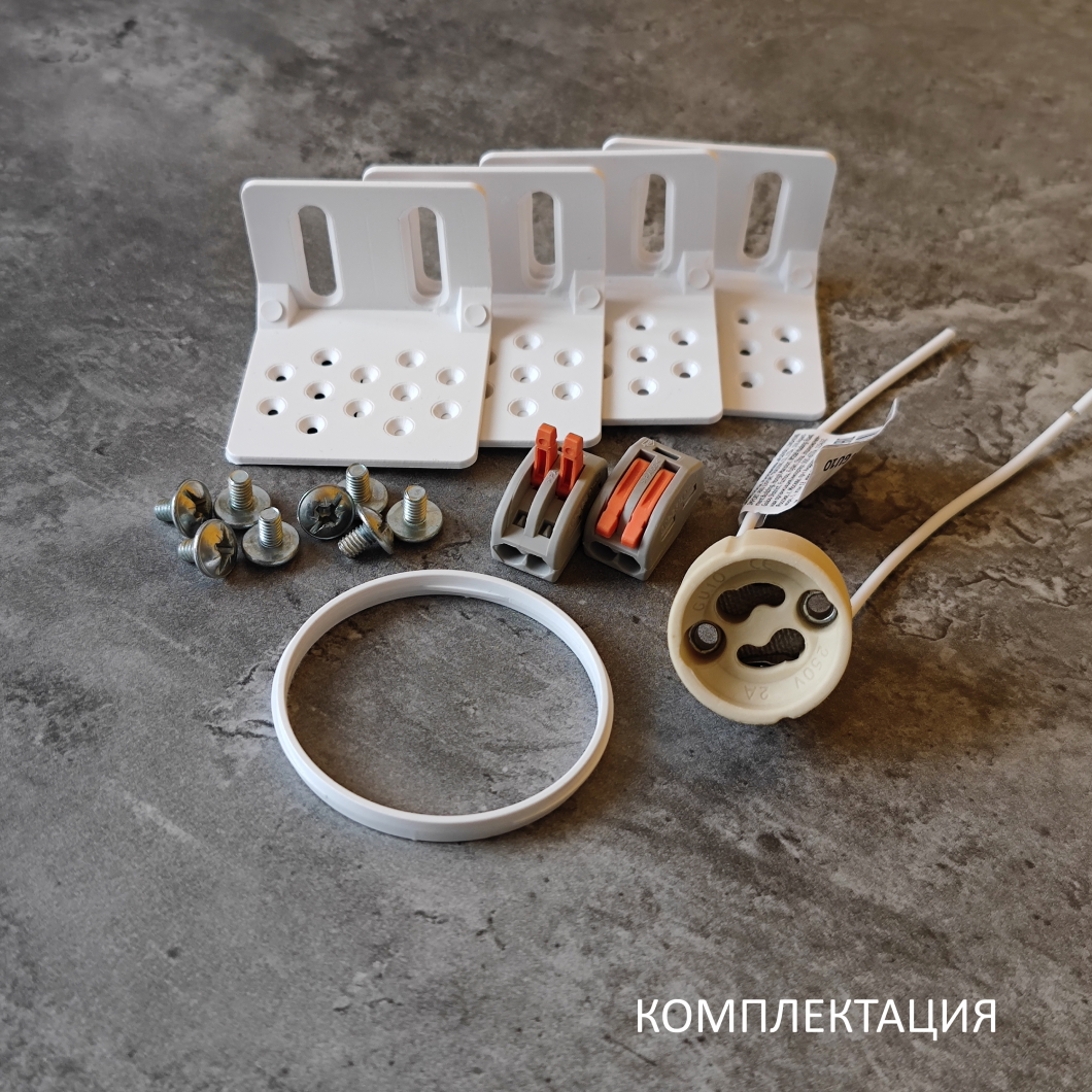 Корпус гипсовый - 1 шт; Кронштейн монтажный регулируемый - 4 шт; Винт установочный - 8 шт; Патрон керамический GU10 - 1 шт; Клемма соединительная - 2 шт; Кольцо стопорное - 1 шт; Руководство по эксплуатации и установке - 1 шт; Упаковка индивидуальная (пен