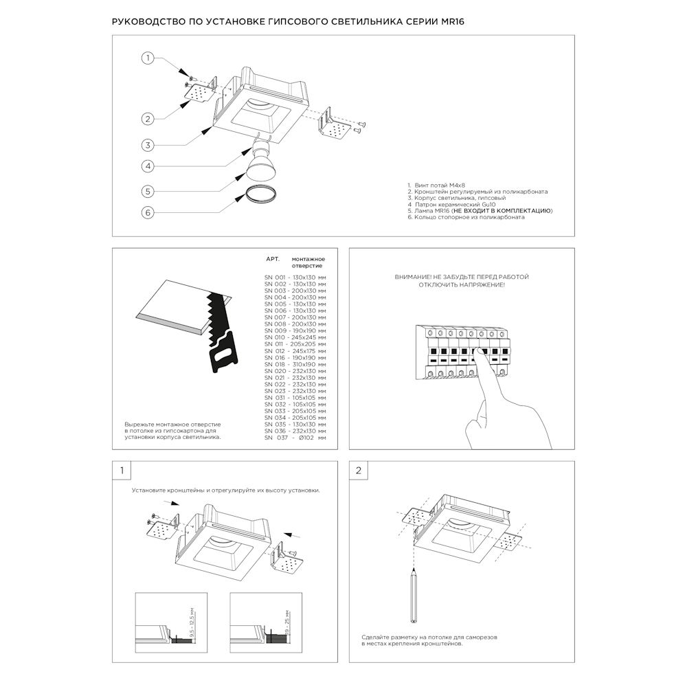 Корпус гипсовый - 1 шт; Кронштейн монтажный регулируемый - 4 шт; Винт установочный - 8 шт; Патрон керамический GU10 - 1 шт; Клемма соединительная - 2 шт; Кольцо стопорное - 1 шт; Руководство по эксплуатации и установке - 1 шт; Упаковка индивидуальная (пен